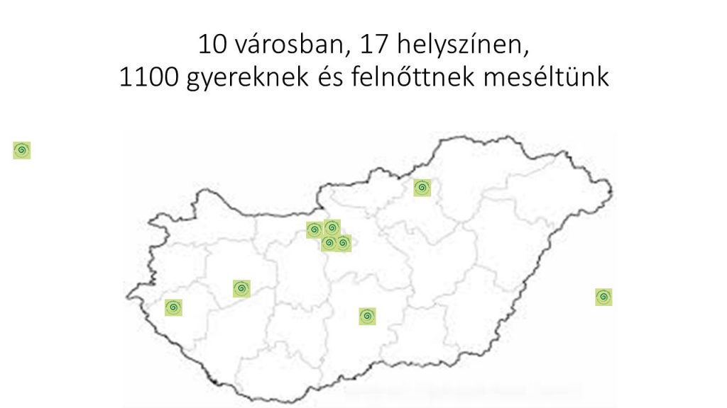 2019. október 15. és november 1. között, ingyenes mesefoglalkozásainkon, meseóráinkon 10 városban, 17 helyszínen 1100 gyereknek és felnőttnek meséltünk-mesélünk.